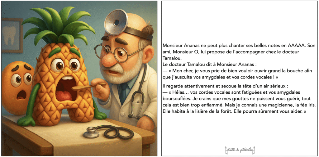 Monsieur Ananas, alias la lettre A, perd sa voix et part en voyage avec son ami O pour retrouver le plaisir de chanter. Sur leur chemin, ils rencontrent la fée Iris, la chouette Ulule et même un Yéti guérisseur, avant de finir dans une grande chorale des voyelles.