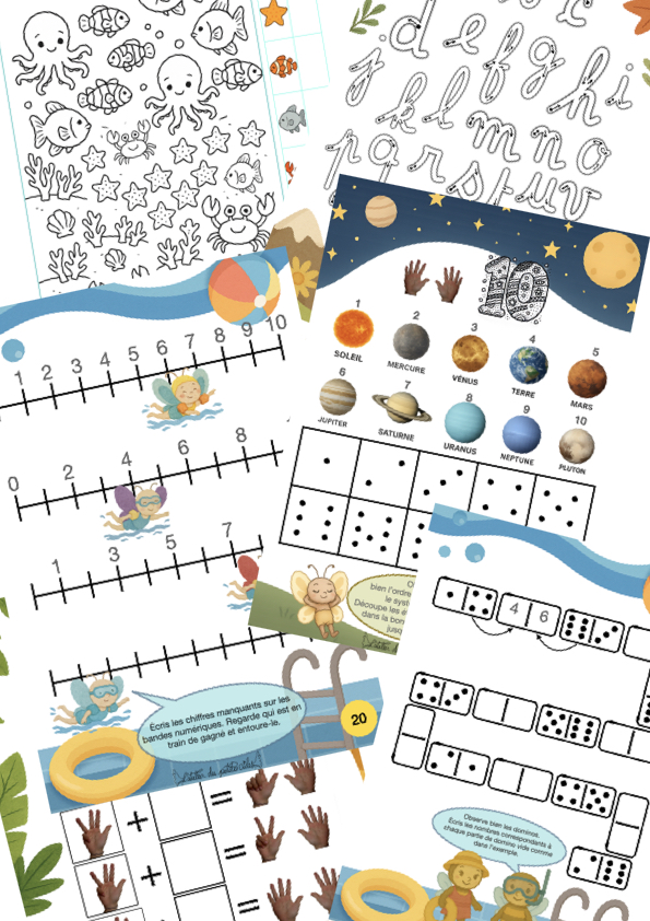Grande Section (5-6 ans) : fiches d’écriture, conscience phonologique, reconnaissance des lettres, vocabulaire, numération, compléments, suites logiques et repérage dans l’espace.